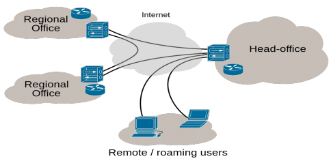 • IPSec VPN: It connects site to site in an organization together and allows secure communications between the sites. The connectivity is allowed with any device supporting standard IPsec.