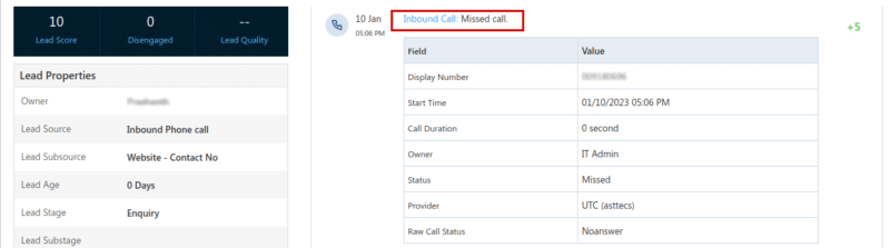 Call based activities are pushed to Leadsquared. Users can view these logs. The call logs are also attached to the client who is related to the call action.