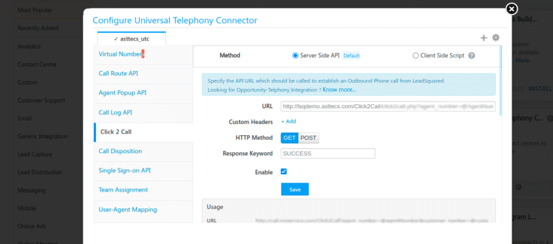 *astTECS Telephony Integration with Leadsquared allows users to perform and log telephony-based activities on the Leadsquared platform. A single platform allows users to have easy accessibility to customer data and history. The feature can be integrated with asterisk-based telephony systems.